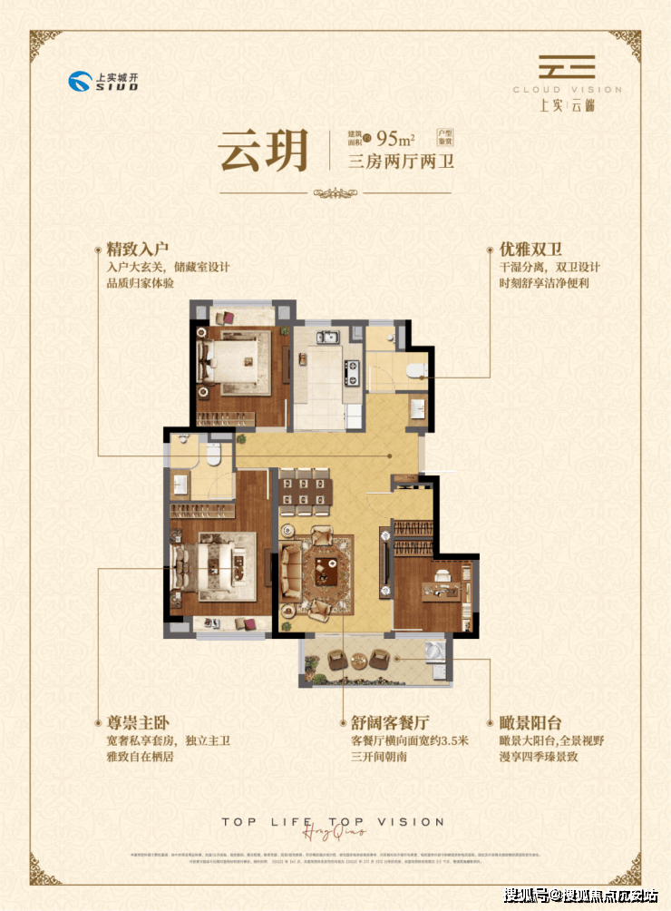 【上实云端官方售楼处咨询热线)约95㎡三房两厅两卫,做到了三开间朝南+瞰景大阳台+主卧套房设计+南北通透+卫生间干湿分离,该户型得房率和空间利用率都非常高.